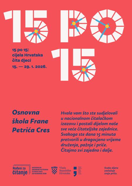 U Osnovnoj školi Frane Petrića uspješno je proveden izazov „15 po 15“, koji se odvijao u razdoblju od 15. siječnja 2025. do 4. veljače 2025. Tijekom 15 radnih dana zaredom čitanje naglas obogatilo je svakodnevni život škole.