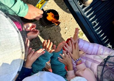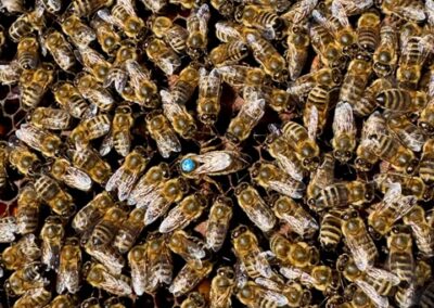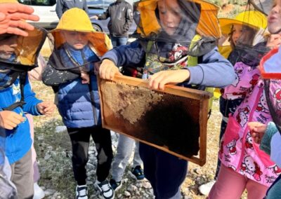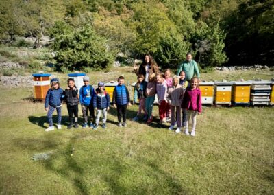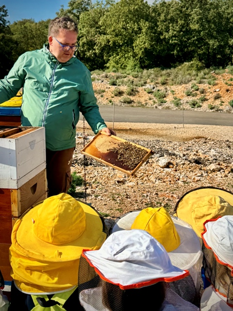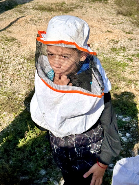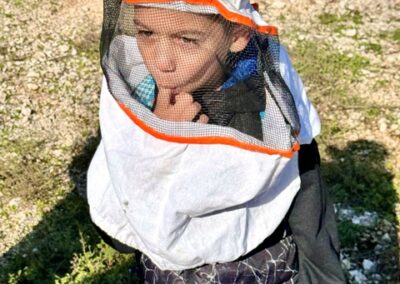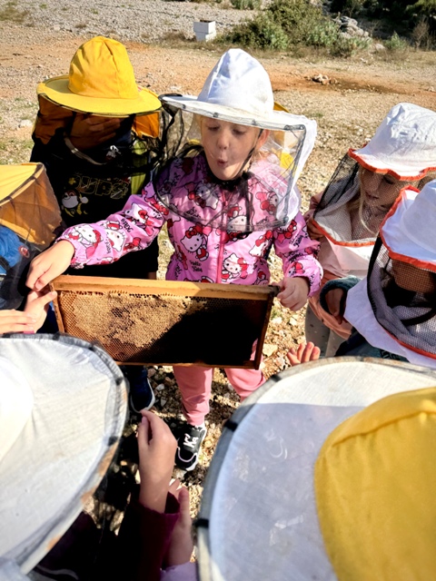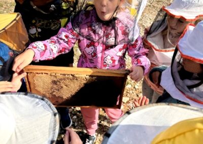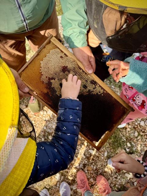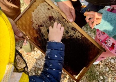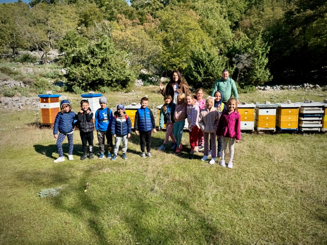 Pčele se već pripremaju za zimovanje i samim time su uznemirenije, međutim iskusni pčelar je procijenio da nam ipak može pokazati unutrašnjost košnice. Imali smo sreće te smo u skupini pčela vidjeli i onu glavnu kraljicu maticu svih pčela. Maleni dječji prstići nisu mogli odoljeti te su “ukrali” med pčelama sa voštanih ćelija.